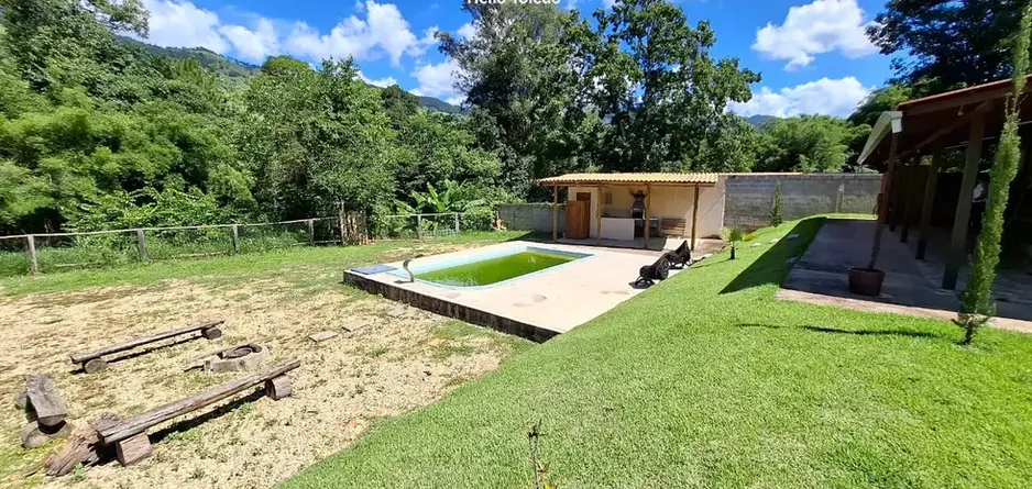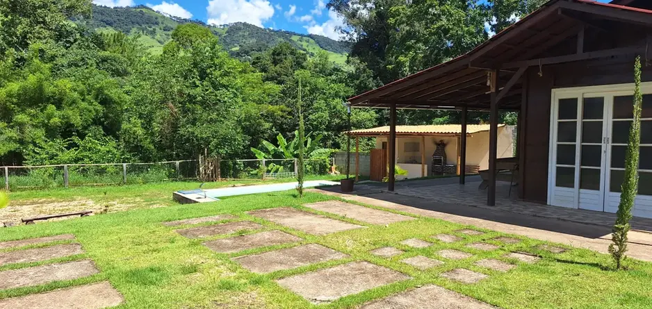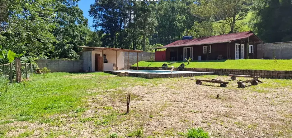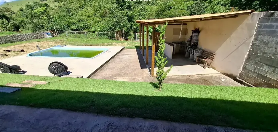 Churrasqueira, piscina, espaço todo gramado e banheiro Social.
