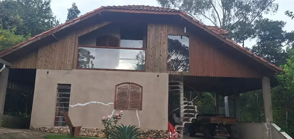 Casa principal com quarto, sala com lareira, cozinha com fogão a lenha, sala de jantar, área de serviço e 2 banheiros no andar debaixo